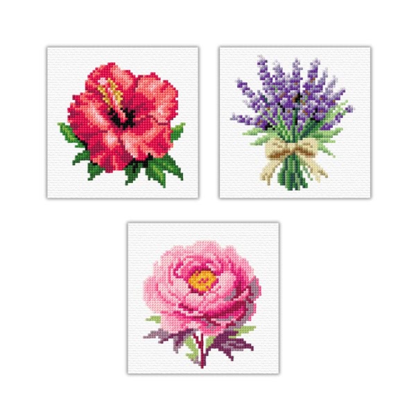 Promocja - kupuj więcej i oszczędzaj! 4 zestawy do nauki haftu krzyżykowego w promocyjnej cenie. Rozmiar wykończonego obrazku 11x11 cm. W skład każdego zestawu wchodzą: - drukowana kanwa aida (gęstość 54 oczka na 10 cm), - komplet dobranej kolorystycznie muliny, - igła.