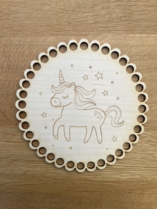 Baza ze sklejki z falbanką i grawerowanym motywem „Jednorożec” to idealne dno do koszyka szydełkowego wykonanego ze sznurka poliestrowego. Naturalna sklejka brzozowa o grubości 3 mm jest lekka, trwała i łatwa w pracy, a delikatny grawer nadaje projektowi bajkowego uroku.