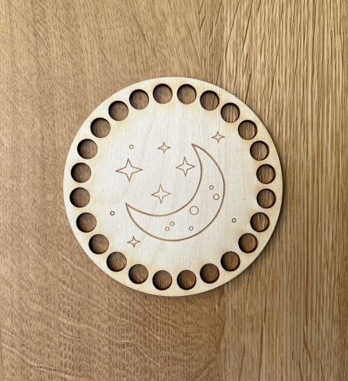 Baza ze sklejki z grawerowanym motywem „Księżyc” to elegancka podkładka do kubka, idealna do wykonania na szydełku ze sznurka poliestrowego. Naturalna sklejka brzozowa o grubości 3 mm gwarantuje trwałość i stabilność, a delikatny grawer dodaje uroku każdemu projektowi handmade.