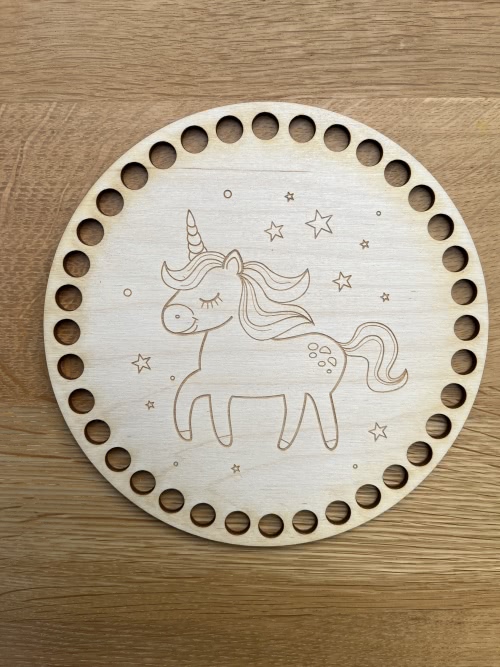 Baza ze sklejki z grawerowanym motywem „Jednorożec” to idealne dno do koszyka szydełkowego wykonanego ze sznurka poliestrowego. Naturalna sklejka brzozowa o grubości 3 mm jest lekka, trwała i łatwa w pracy, a delikatny grawer nadaje projektowi bajkowego uroku.